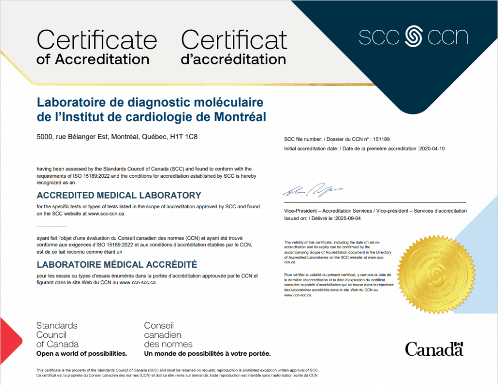 Toutes les activités du laboratoire de diagnostic moléculaire de l’ICM sont effectuées au Québec à partir d’installations permanentes situées au premier étage du bloc centre de l’Institut de cardiologie de Montréal.